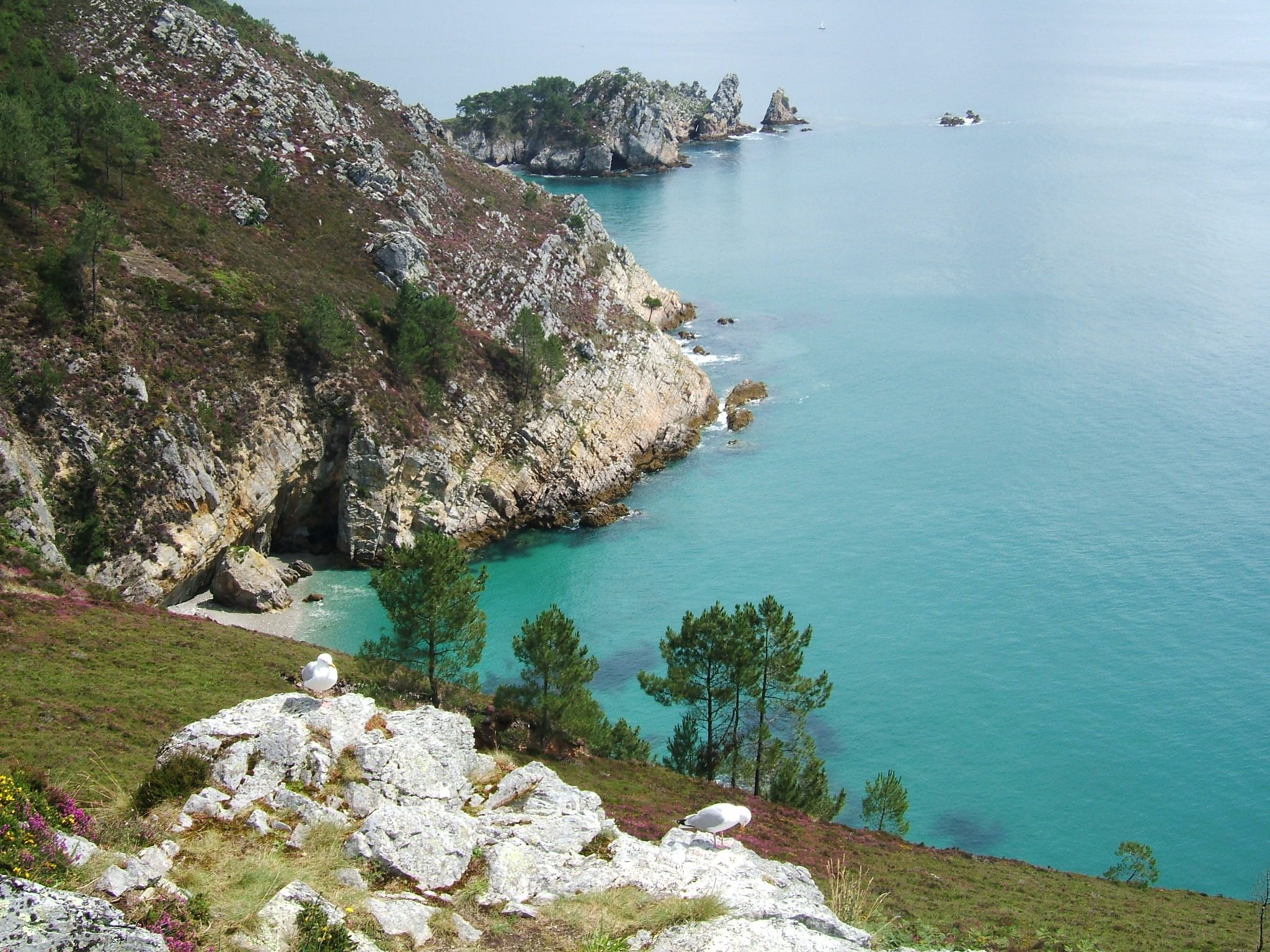 Court transfert en taxi jusqu’à l’immense plage de Goulien, point de départ de la randonnée. Vous découvrez les rochers ruiniformes du “Château” de Dinan, un superbe promontoire face à l’océan, avant de poursuivre vers la frêle silhouette du cap de la Chèvre en suivant le sentier côtier qui longe les plages de Lostmarc’h et de la Palue. Le Cap de la Chèvre, s’élevant à plus de 100 m au-dessus des flots, offre des panoramas spectaculaires sur le littoral breton. La journée se termine par un court transfert et installation à Morgat pour 2 nuits, charmante station côtière de la presqu’île de Crozon.